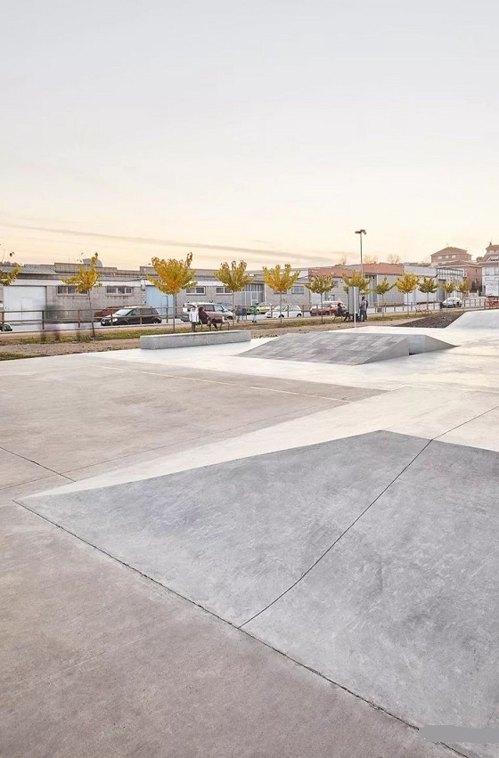 成排的綠樹為滑板公園提供必要的樹蔭遮擋,也在滑板區(qū)與其他公共空間之間劃定界限,傾斜的坡道以綠植鋪面,分層的場地為滑板節(jié)及各種體育活動提供了理想的場地。綠植覆蓋避免了一些不受歡迎的涂鴉同時增加美感,花崗巖巧妙的圍合滑板區(qū)域。